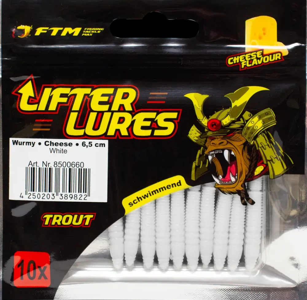Lifter Lures Wurmy Cheese er et effektivt gummiagn til put and take-fiskeri.Den unikke ostearoma lokker ørreder og øger chancerne for fangst markant. Med en længde på 6,5 cm og en flydende egenskab kan Wurmy nemt fiskes med et bombarda-flåd eller frit i vandet. Det fleksible design skaber realistiske bevægelser og gør den synlig for fisk i alle vandlag. Perfekt til danske ørredvande og leveres i en pakke med 10 stk.