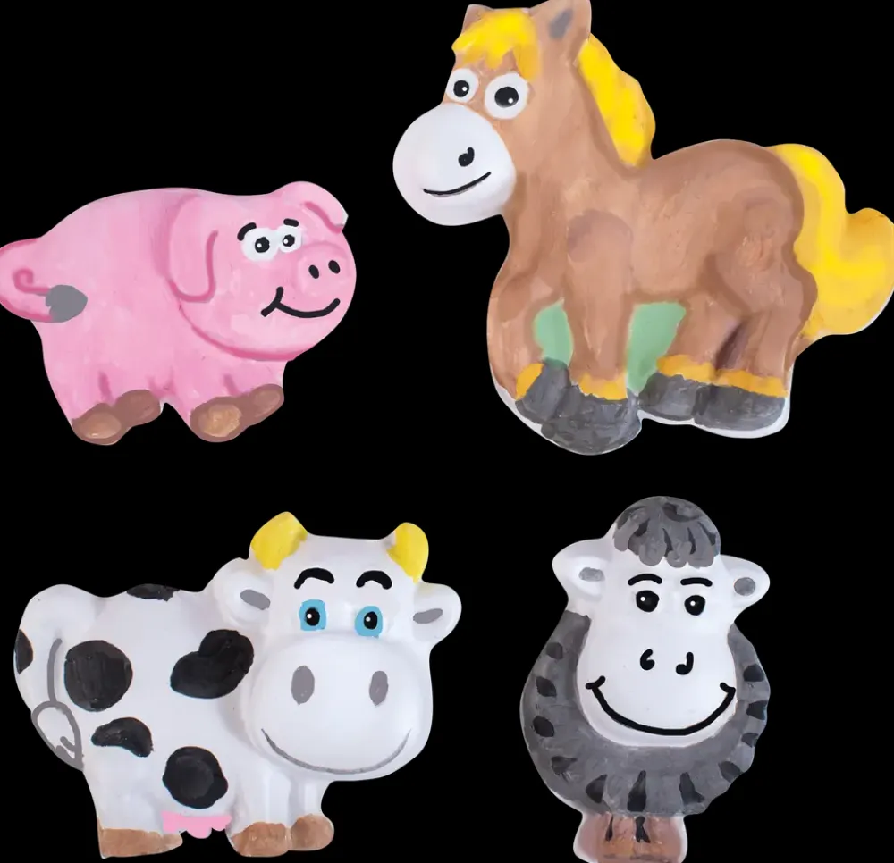 Gipsforme af fire forskellige bondegårdsdyr: gris, hest, ko og får. Når gipsen er tør, kan figurerne farvelægges med vandfarver, akrylmaling eller andre typer maling. Formen er fremstillet i gennemsigtigt PET-plast, hvilket gør det let at se, om gipsen er jævnt fordelt.