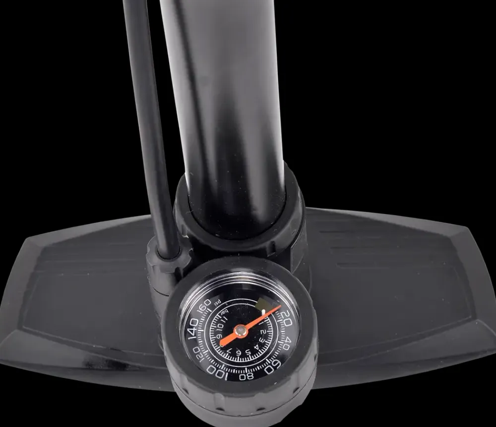 Effektiv fodpumpe med manometer, der gør det nemt at holde styr på det korrekte dæktryk. Pumpen har en stabil bund med skridsikkert underlag, så du kan placere fødderne sikkert under brug. Det store og letlæselige manometer giver tydelig aflæsning af trykket op til 9 bar / 136 PSI.Pumpen passer til Presta-, Schrader- og Dunlop-ventiler og kan bruges til en bred vifte af cykler som BMX, racercykler, touringcykler og mountainbikes. Den medfølgende adapter gør det desuden muligt at pumpe bolde, legetøj og visse typer dæk til motorcykler og biler.