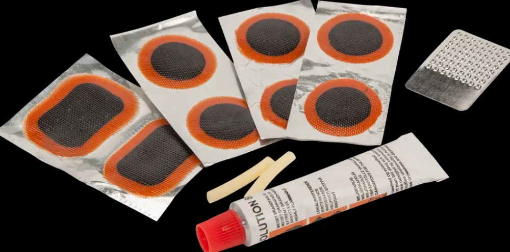 Komplet lappegrejssæt bestående af 8 stk. lapper (6 runde og 2 firkantede), 2 stk. ventilgummi, 1 stk. solution-lim (6 ml.) og 1 stk. opridser.