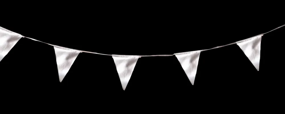Guirlande med vimpler, 4 meter i sølv.12 vimpler på 19 x 14 cm.
