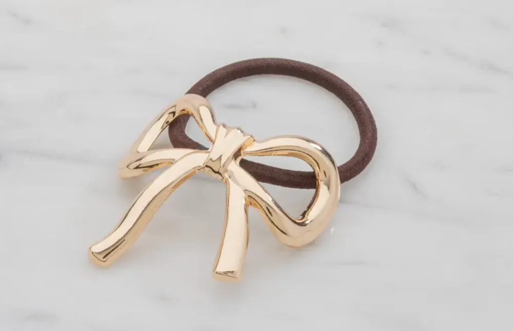 Hårelastik med en guldfarvet zinksløjfe, der giver en elegant og stilfuld detalje til frisuren. Perfekt til både hverdag og fest. Hårelastikken er fremstillet i zink og polyester og er nikkelfri. Ikke vandresistent – bør holdes fri for vand og kemikalier for at bevare sin finish.