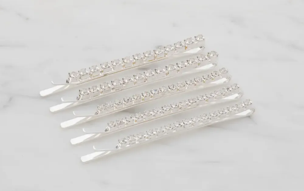 Sæt med 5 sølvfarvede hårspænder dekoreret med funklende sten. Designet til at holde håret sikkert på plads og tilføre et elegant udtryk. Velegnet til både hverdag og festlige anledninger.Hårspænderne er lavet af zink og jern og er nikkelfri. Ikke vandresistente – bør holdes fri for vand og kemikalier for at bevare glansen.