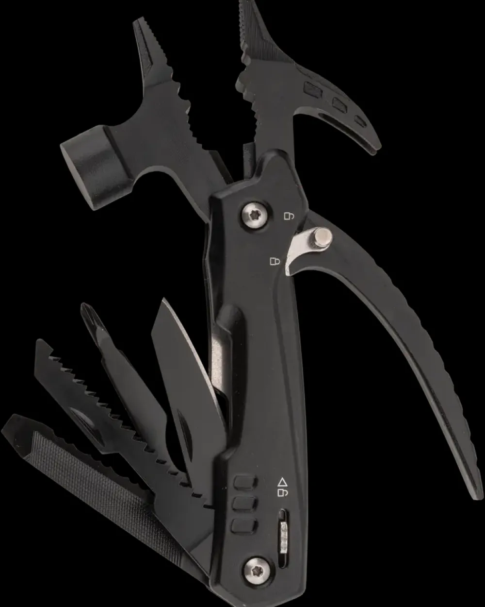 Multifunktionel hammer i rustfrit stål med 12 funktioner.Inkluderer spidstang, kombitang, trådskærer, hammer, klemme samt skruetrækkere til både lige kærv og stjerneskruer. Derudover har den tandkniv, neglefil, flaskeåbner, kniv og fil.Velegnet til både hjemmebrug og udendørs aktiviteter. Den kompakte størrelse på 15 cm og sorte finish gør den nem at transportere og opbevare.