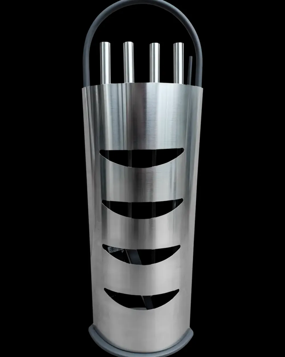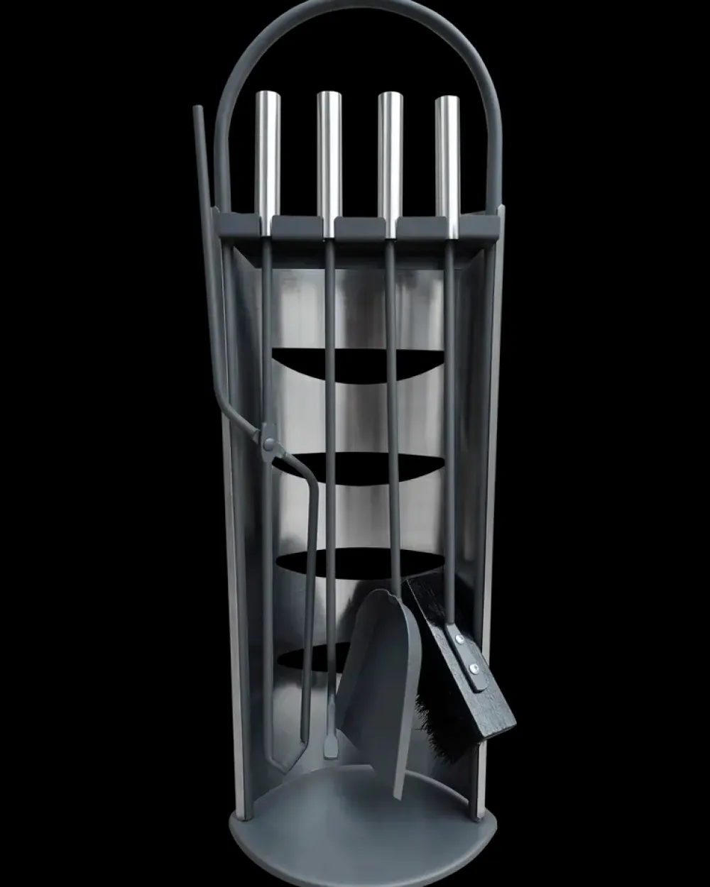 Komplet pejsesæt i moderne design med panel og håndtag i rustfrit stål. Sættet består af fem dele: ildrager, skovl, børste, tang og stativ – samlet i én funktionel løsning til vedligeholdelse af brændeovn eller pejs. Hver del har sin faste plads i det robuste stativ, som har bærehåndtag og er nemt at flytte.Sættet er fremstillet af slidstærkt metal med sorte og børstede stålkomponenter, der sikrer lang holdbarhed og et stilrent udtryk. Værktøjerne er funktionelle og lette at bruge, hvilket gør det nemt at fjerne aske og holde området omkring pejsen rent. Det pladsbesparende, vertikale design bidrager til et elegant udtryk i stuen.