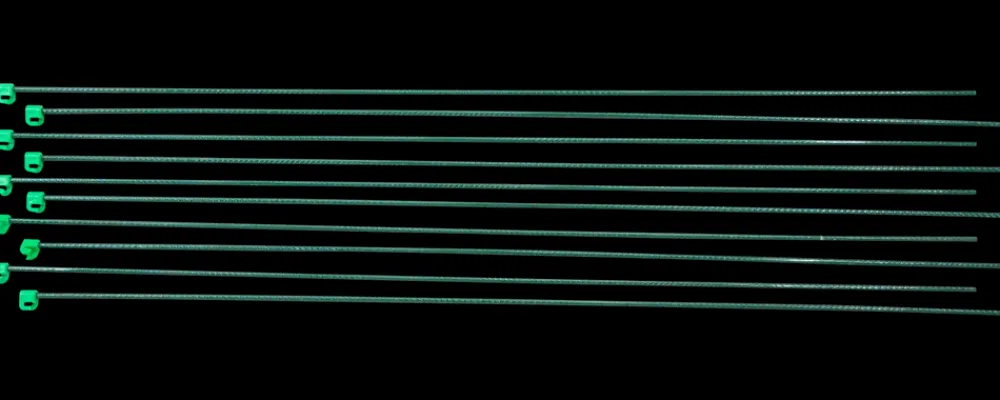 Et bundt med 10 stk grønne tentor-hegnspæle. Med grøn slagfast isolator med krog, hvor tråden nemt trækkes igennem.8 mm. armeringsstål.