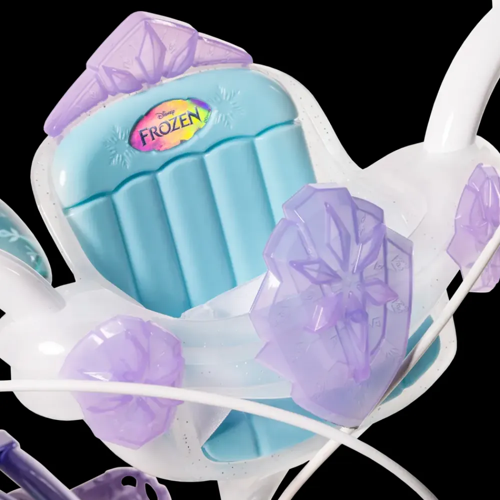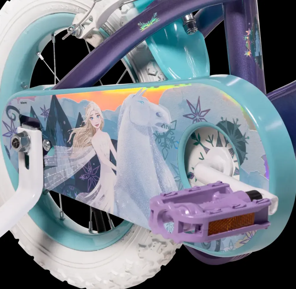 En 12″ børnecykel til børn i alderen 3–5 år med benlængde ca. 35–40 cm. Cyklen har metallisk lilla stel og Frozen-grafik på ramme og fuldt lukket kædeskærm. Sadel, greb og skærme følger temaets farver. På styret er der en dukkeholder samt en lille klokke.Modellen har frihjul, håndbremser for og bag, støttehjul og skærme. Cyklen leveres 85% samlet og færdiggøres af en voksen.