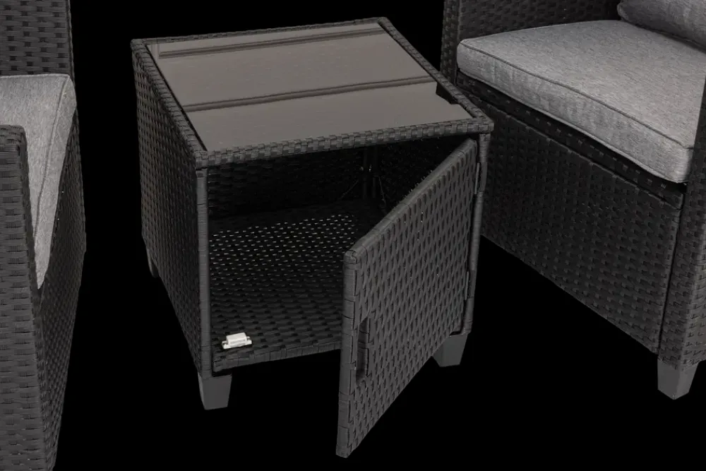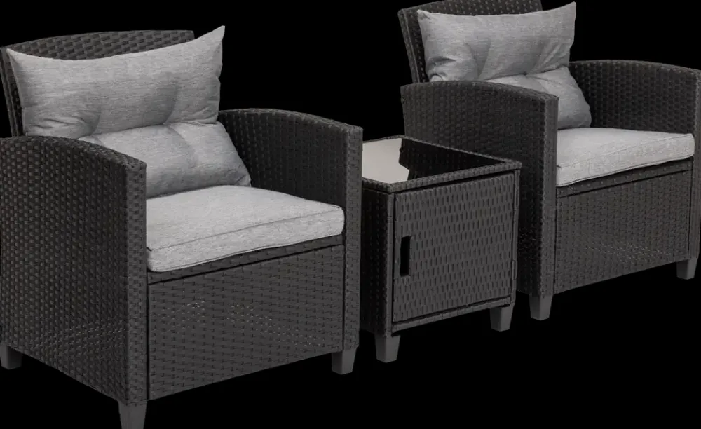 Cafésættet Jakarta består af 2 stole og et bord og kan bruges på terrasse, altan eller i haven, hvor der ønskes siddeplads til 2 personer. Bordet har opbevaringsrum under bordpladen, så småting kan placeres samlet og let tilgængeligt.Sættet er opbygget med stålramme med pulverlakering. Bordpladen er i hærdet glas, og stolene har grå hynder i polyspun, som giver en blød siddeflade og ryglæn. Den flettede overflade giver et ensartet udtryk, og bordets låge i front giver adgang til opbevaringsrummet.Tekniske detaljer og mål:Farve: sort med grå hynderMateriale: stålramme med pulverlakering, hærdet glas, polyspun 210 g/m²Bord: H. 44,5 x B. 45 x D. 45 cmStol: H. 78 x B. 67 x D. 67 cm