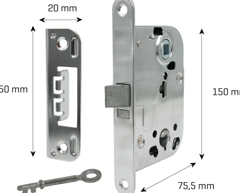 Låsekasse til mellemdør/indvendig dør (2014) med elgalvaniseret overflade og stolpe i krom.Inkl. slutblik og nøgle.Modellen er vendbar.Overflade: Krom.Centerafstand: 72 mm.Dorn 45 mm.Stolpemål: 150 x 20 mm.