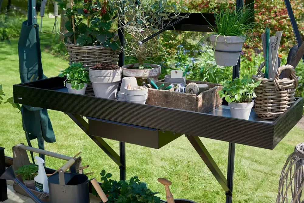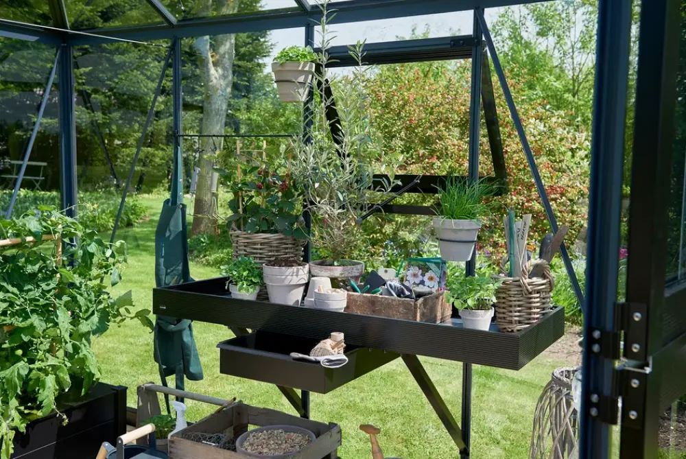 Julianas integrerede drivhusbord er perfekt til en arbejdsplads i drivhuset. Det passer til Juliana drivhusenes design. På bordets underside findes en udtræksskuffe, der kan bruges til opbevaring.2 sektioner.