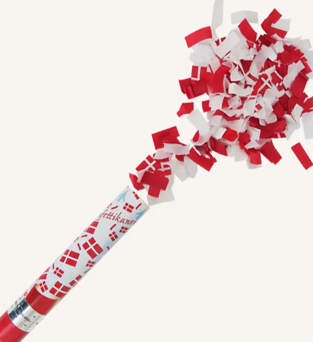 Stor konfettikanon.Konfettiet er rød/hvid med dannebrogs flag.