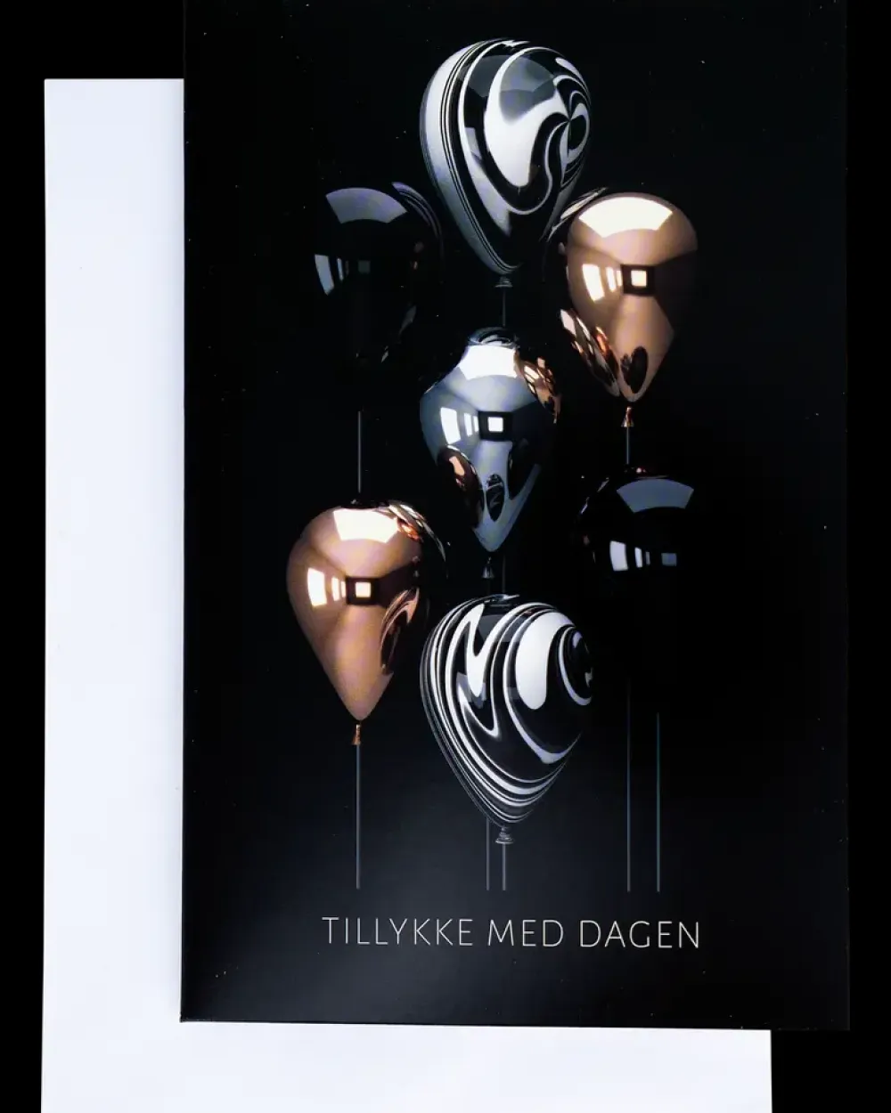 Kort med balloner i sort og “tillykke”-tekst.Kuvert medfølger.