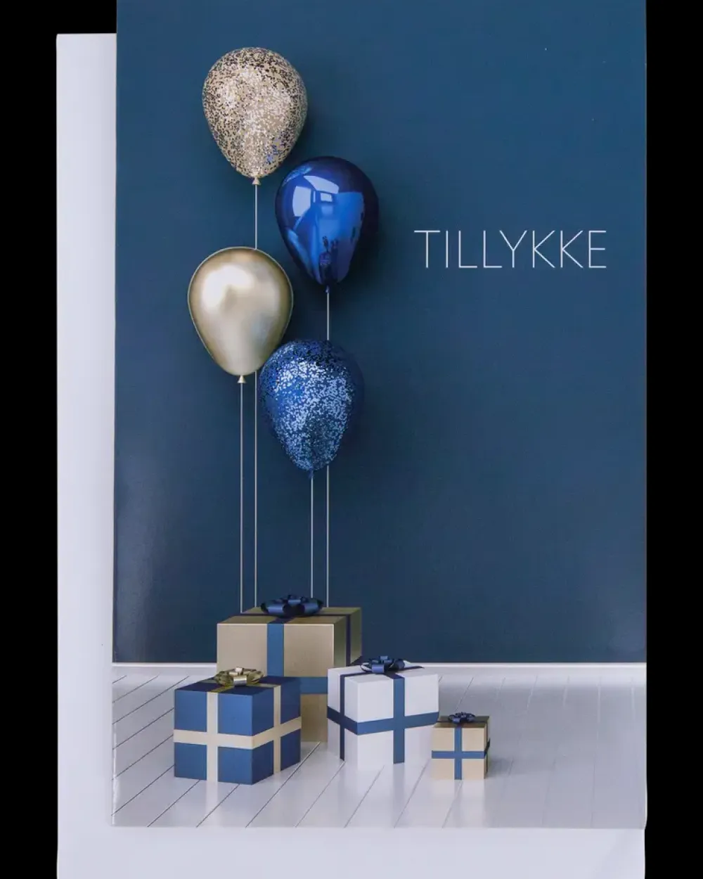 Flot lykønskningskort med motiv af balloner og gaver på blå baggrund, som er perfekt at bruge, når man vil give et kort med en personlig hilsen.Kuvert medfølger.
