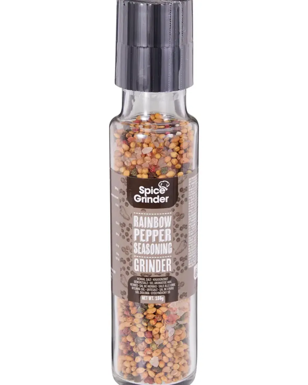 Krydderikværn i glasbeholder med integreret kværn, som gør det nemt at tilføje friskkværnede krydderier direkte til maden. Med en højde på 23 cm og en diameter på 5 cm ligger kværnen godt i hånden og har en funktionel størrelse til daglig brug i køkkenet.Produktet findes i 6 assorterede varianter, der giver mulighed for variation i smagen: Pink Salt (300 g), Mediterranean Salt (240 g), Rainbow Pepper (180 g), Chilli Salt (220 g), Garlic & Herb Salt (240 g) og Asian Fusion (230 g). Udvalget giver fleksibilitet i madlavningen – uanset om der ønskes en klassisk saltprofil, en krydret blanding eller smag med urter og krydderier.Beholderen er fremstillet i glas, så det er nemt at se indholdet, og den indbyggede kværn sikrer jævn fordeling og nem brug ved bordet eller under madlavning.Variant kan ikke vælges ved køb i webshoppen.