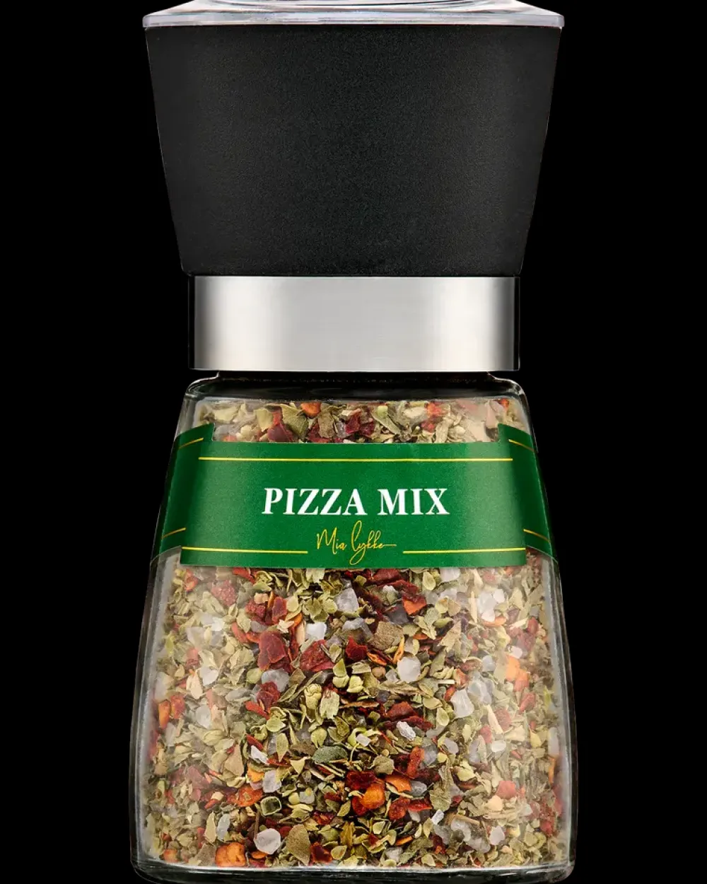 Krydderikværn med krydderi – denne variant byder på Pizza Mix.Krydderiet er specielt udviklet til brug på pizza, men kan også bruges til meget andet og er bekvem at have ved hånden under madlavningen.Selve beholderen er lavet i glas, er elegant udformet og kan derfor sagtens stilles direkte på bordet.