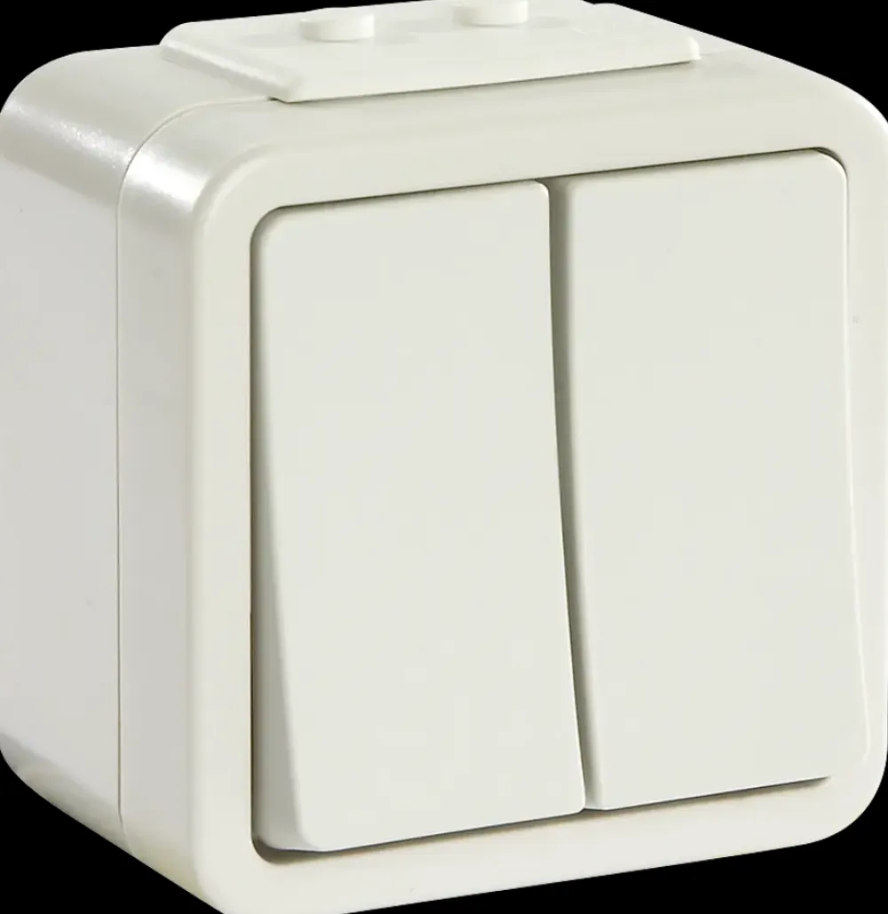 Dobbelt afbryder i UV bestandigt termoplast, til brug udendørs eller i vådrum.Stikkontakten er stænktæt og med jord. Leveres komplet med underlag, indsats, samt membranpakning og tangent/afdækning.Må kun installeres af en autoriseret el-installatør.