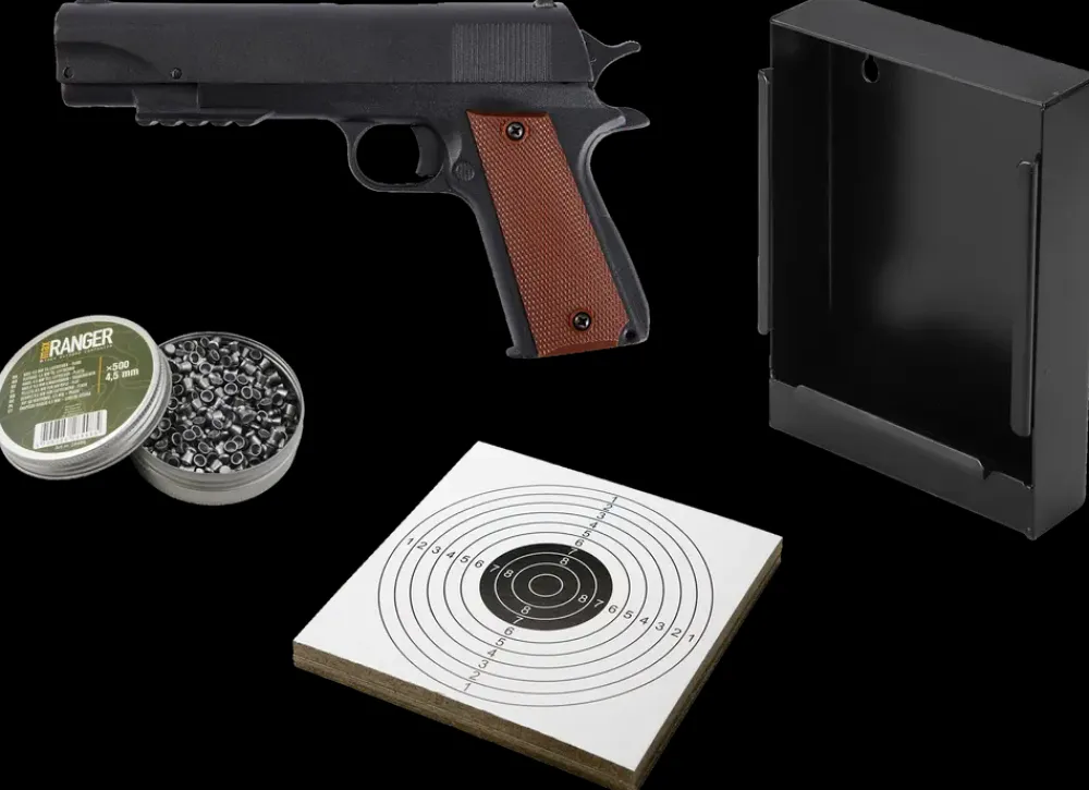 Luftpistol med justerbart sigte og Pump- og Single-shot affyring.Sættet består af:Luftpistol.500 stk. 4,5 mm. hagl.100 skydeskiver.Hagl størrelse: 4,5 mm.Udgangshastighed 4,5 mm hagl: 91 m. sek.Luftgevær og luftpistoler sælges ikke i vores webshop og ikke til personer under 18 år.