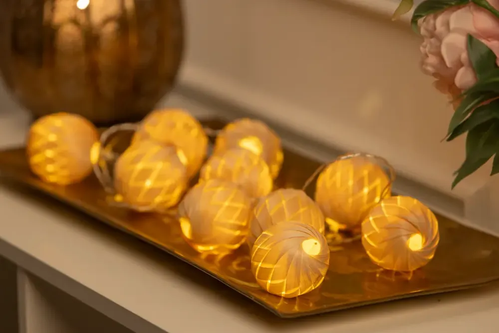 Dekorativ lyskæde med 10 LED-pærer, der er omkranset af små, fine bambuslanterner. Lyskæden skaber en hyggelig atmosfære med et varmt, hvidt lys. Til indendørs brug.Bruger 2xAA batterier (medfølger ikke).