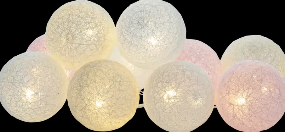 Fin dekorationslyskæde med kugler i bomuldstråd til indendørs brug. Kan hænges op, pynte på bordet eller bruges som dekoration i en glasvase m.m. Farvekombination: Hvid, varmhvid og rosa. Farve, lys: Varm hvid.Bruger 2 x AA batterier (ekskl.).
