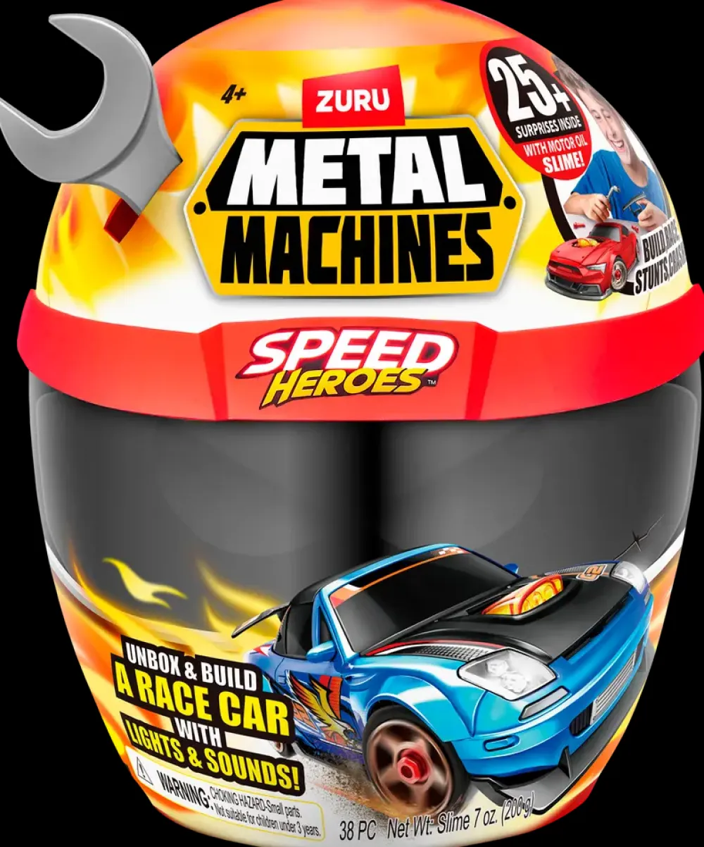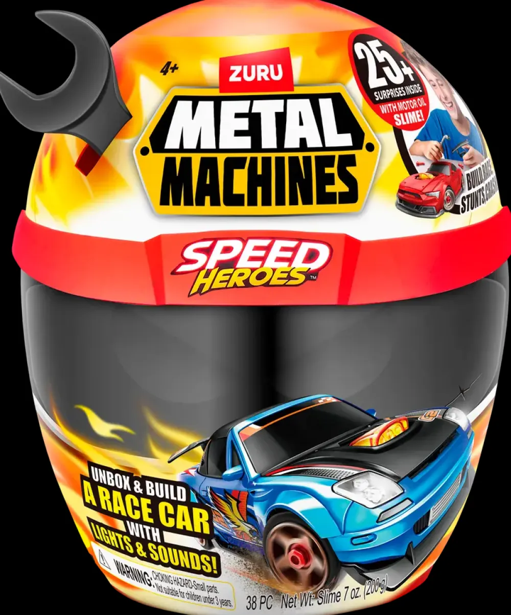 Oplev fart, sjov og kreativ leg med Zuru Metal Machines Speed Heroes! Denne spændende racerhjelm gemmer på over 25 overraskelser, som børnene kan udforske, når hjelmen åbnes. Indeni finder du dele til at bygge din helt egen racerbil – fra karrosseri og motordele til klistermærker og dekorationer, så bilen får sit helt personlige udtryk.Med to forskellige bilstel i hver hjelm kan du kombinere og tilpasse udseendet på flere måder. Når bilen er samlet, vækkes den til live med lys og realistiske motorlyde, som gør legen endnu mere virkelighedstro. De mange dele giver mulighed for at bygge, skille ad og samle igen, så legen kan fortsætte i timevis.Hver Speed Hero leveres med to unikke bilstel, og der findes i alt seks modeller at samle i serien. Raceren bruger 3 stk. LR44-batterier (inkl.), så den er klar til at køre direkte ud af pakken. Et sjovt og engagerende byggesæt, der kombinerer kreativitet, konstruktion og actionfyldt leg for børn fra 4 år.Specifikationer:Farve: Flere farverMateriale: 83,95% PP, 13,22% ABS, 1,57% Clear PP, 0,51% Fe₃O₄, 0,48% jern, 0,1% glasfiber, 0,1% silikone, 0,04% kobber, 0,02% PE, 0,01% TPUIndhold: 20+ overraskelser, 2 bilstel, klistermærker, dele til racerbil, slimeBatterier: 3 stk. LR44 (inkl.)Egenskaber: Lys- og lydeffekter, udskiftelige dele, flere kombinationsmulighederAnbefalet alder: Fra 4 årModel kan ikke vælges ved køb i webshoppen.