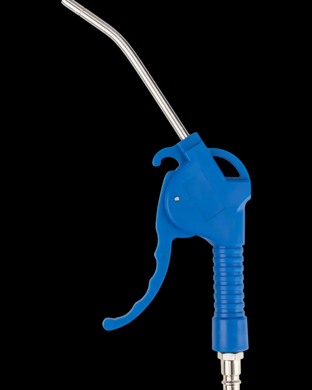 Blæsepistol med nippel til tilslutning af trykluft. Pistolen anvendes til rengøring af værkstedsområder, maskiner og arbejdsborde, hvor der er behov for præcis og kraftig luftstrøm. Det bøjede rør giver adgang til svært tilgængelige steder, såsom hjørner og smalle sprækker.Pistolen er udstyret med en lynkoblingsnippel for hurtig montering på trykluftslange. Det 10 mm tykke rør i metal sikrer god luftgennemstrømning og lang holdbarhed. Grebet er udformet i rillet plast med aftrækker, der giver et godt greb og enkel betjening.Maksimalt driftstryk: 8 bar.