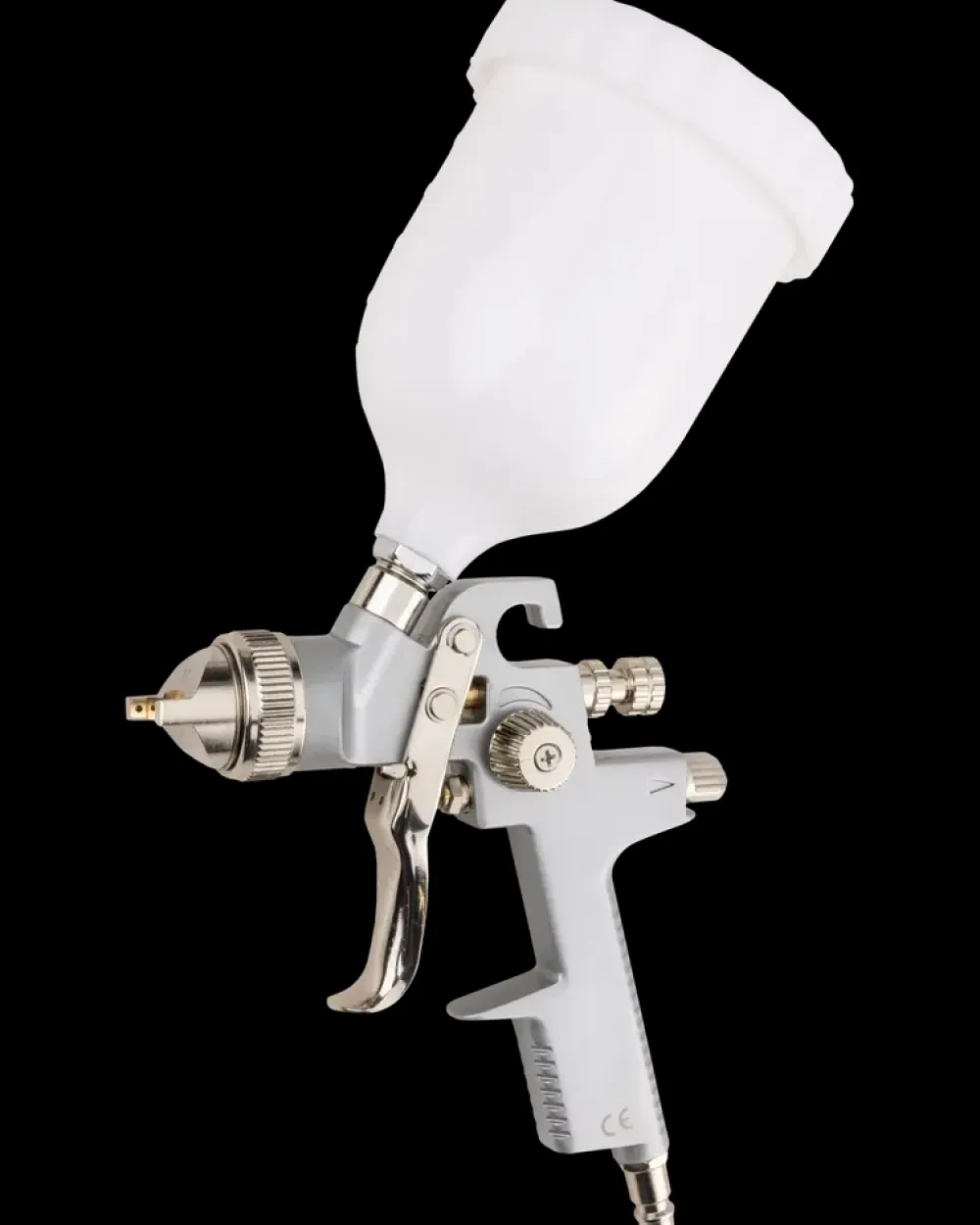 Lavtryksmalerpistol med plastbeholder og 1,7 mm dyse, velegnet til vandbaserede malinger. Dyse og farvenål er i rustfrit stål og de indre luftgange er lavet i messing, for at sikre en længere levetid.Viften kan reguleres til rund eller flad stråle, så det er muligt at tilpasse sprøjten til de fleste objekter.