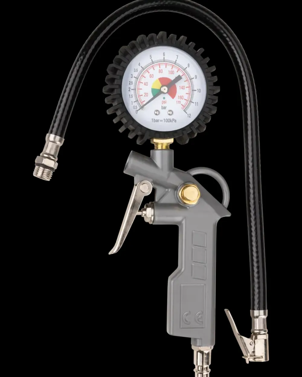 Pumpepistol til oppumpning af dæk på bil, knallert og cykel. Udstyret med manometer, reguleringsventil og 40 cm PVC-slange.Tilsluttes med lynkobling til standard trykluftsystem. Passer til almindelige ventiltyper.Manometeret viser dæktrykket nøjagtigt, og udluftningsknappen gør det muligt at finjustere trykket. Pistolen har robust greb og låsefunktion til ventilen.Maks. arbejdstryk: 8 bar. Kompakt design – nem at opbevare i bil eller værksted.