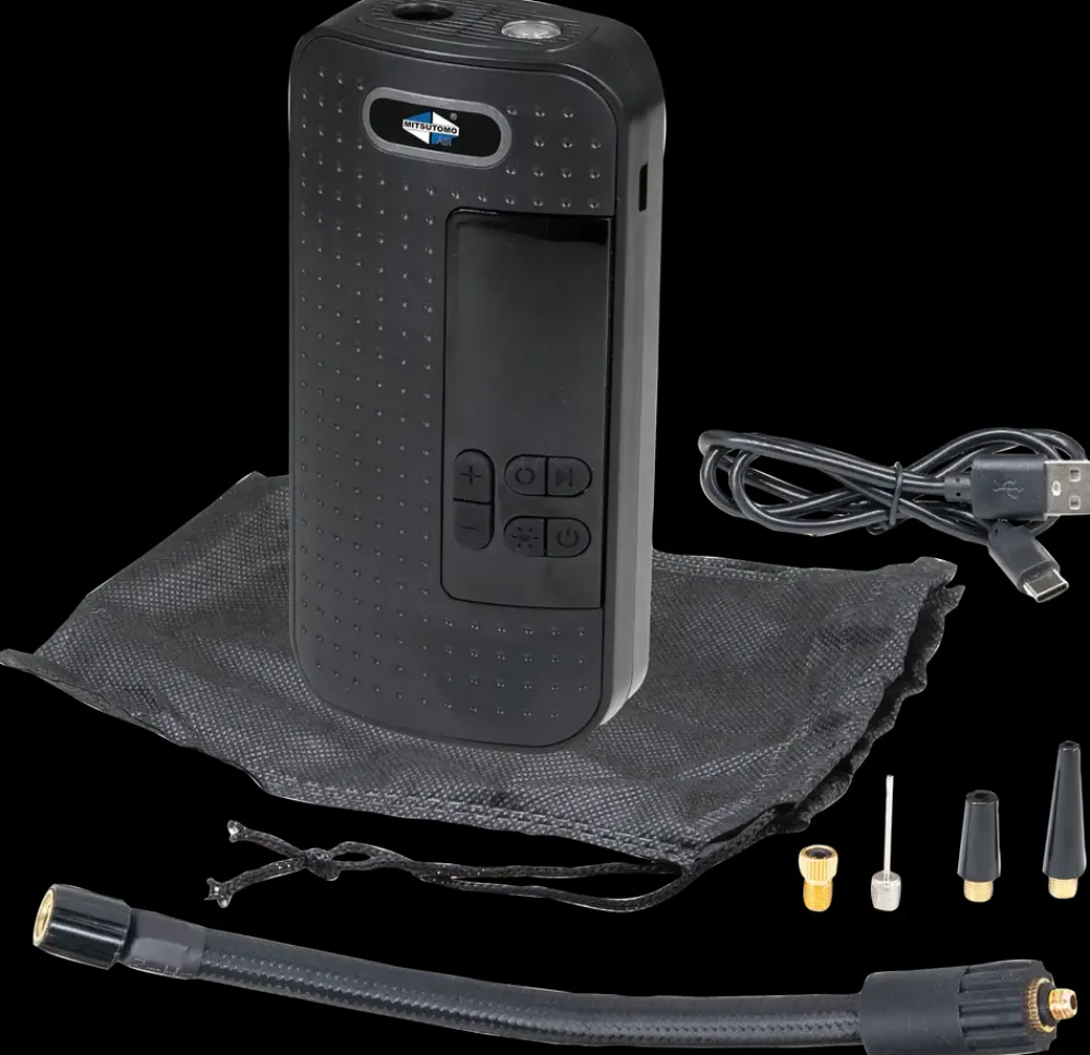 Transportabel kompressor fra Mitsutomo Air er en praktisk og alsidig løsning til oppumpning af bolde, cykeldæk, bildæk og meget mere. Med en maksimal trykkapacitet på 10,3 bar (150 PSI) og en slagvolumen på 12 liter pr. minut kan den håndtere mange forskellige opgaver hurtigt og effektivt. Den er udstyret med et digitalt display og indbygget LED-lys, som gør den nem at bruge – selv i mørke. Inkluderer 4 dyser, 20 cm slange, USB-C ladekabel på 50 cm og opbevaringspose.Spænding: 8V.Lithium batteri 2000mAh.Maks tryk: 10,3 bar / 150PSI.Slagvolumen (liter/min.): 12 L/min. Med digitalt display. Indbygget LED lys.