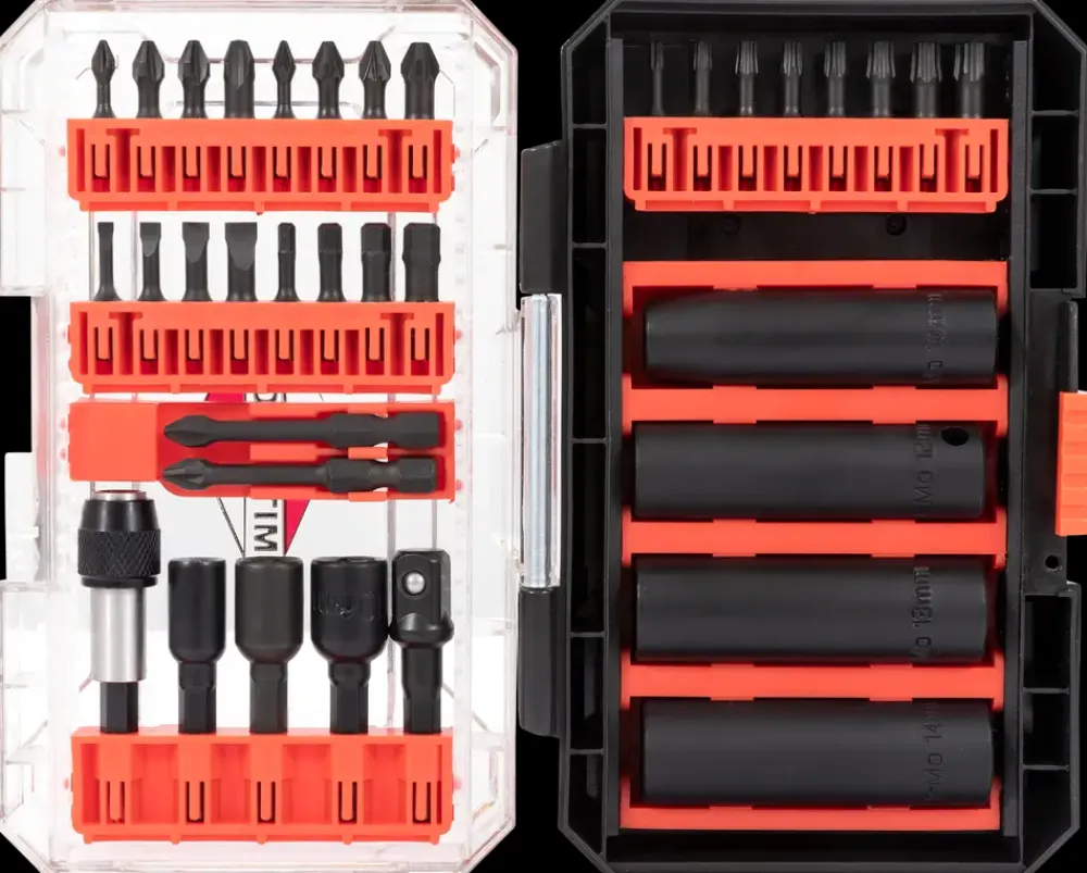 Sættet indeholder 35 dele, herunder forskellige bits og toppe, der er fremstillet af stærkt S2 stål. S2 stål er kendt for sin holdbarhed og modstandsdygtighed over for slid.24 stk. 25 mm bits:PH: 1, 2, 2, 3PZ: 1, 2, 2, 3SL: 3, 4, 5, 6TX: 10, 15, 20×2, 25×2, 27, 30, 40H: 3, 4, 5, 62 stk. 50 mm bits:PH2PZ24 stk. Toppe: 10, 12, 13, 14 mm3 stk. Bitstoppe: ¼ x 6 mm¼ x 8 mm¼ x 10 mm1 stk. 65 mm ¼ x 3/8″ topadapter1 stk. 60 mm Bitshoder quick release