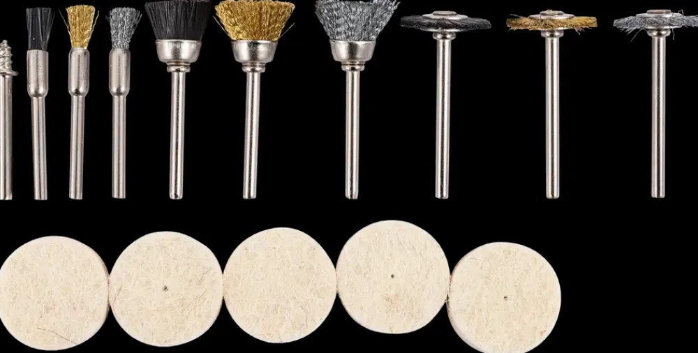 Børste- og polersæt til rengøring og bearbejdning af metal og sten. Sættet passer til minislibere og boremaskiner, hvilket gør det velegnet til præcisionsarbejde.Det 3 mm skaft passer til de fleste maskiner, og sættet kan bruges ved op til 15.000 omdrejninger i minuttet.Indhold:9 stk. børster (kunststof, stål, messing).5 stk. polerskiver i filt.1 stk. spindel.