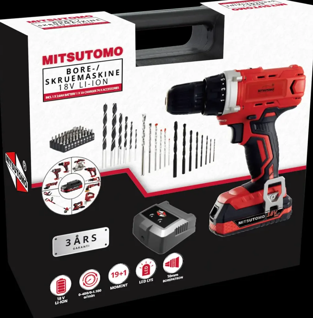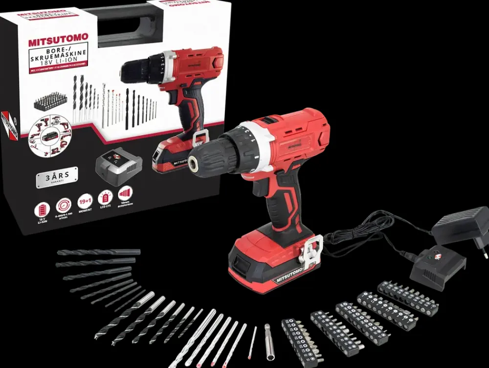 Mitsutomo bore-/skruemaskine 18V er et batteridrevet værktøj til boring og skruning i træ, metal og murværk. Maskinen leveres som sæt med 2,0 Ah Li-ion batteri, 1 A oplader og 71 dele tilbehør, så den kan tages i brug med det samme. Med to gear og momentindstilling er den velegnet til både montageopgaver og lettere borearbejde i hjem og værksted.Maskinen har 2 gear med en nominel hastighed på 0–400 / 0–1.100 o/min samt 19+1 momentindstillinger. Maks. drejningsmoment er 35 Nm, og borepatronen har en spændvidde på 10 mm. Integreret LED-lys giver arbejdslys ved skruning og boring, og grebet er udført med blød overflade. Batteriet er udstyret med indikator for ladestatus.Sættet indeholder 50 CRV-bits (bl.a. Torx, Phillips, Pozidriv, lige kærv, unbrako og firkant), 6 træbor (3–8 mm), 8 HSS-metalbor (2,5–8 mm), 6 murbor (4–8 mm) samt bitsholder.Tekniske data:Spænding: 18 V Li-ionBatteri: 2,0 AhOplader: 1 A (opladetid ca. 135 min.)Hastighed: 0–400 / 0–1.100 o/minMomentindstilling: 19+1Maks. moment: 35 NmBorepatron: 10 mm