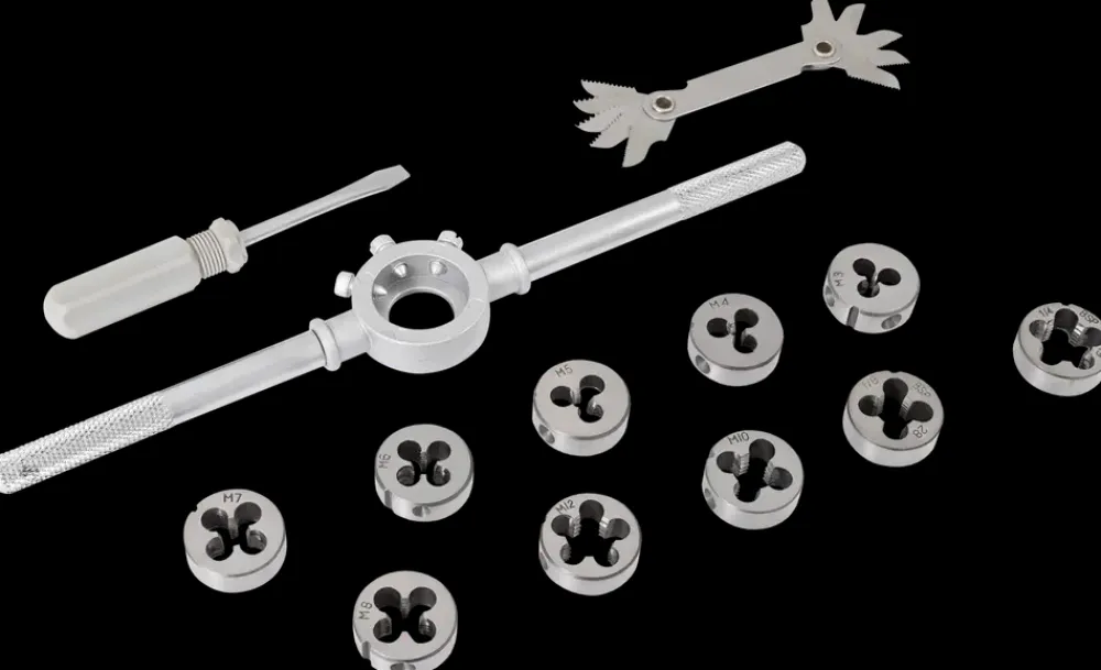 Stort gevindskæresæt fra Mitsutomo, leveret i praktisk opbevaringskuffert.Sættet kommer med både gevindtapper til indvendigt gevind og gevindbakker til udvendigt gevind. Med værktøjerne kan man også skære nye gevind, reparere og forsigtigt rense eksisterende gevind.Gevindene kan laves både manualet eller med maskine.Fungerer til bla. karbon stål, jern, aluminium, kobber, rustfri stål mm.Benyt skæreolie ved brug for bedste resultat, og for at ungå overophedning.Sættet består af :10 x snitbakker: M3, M4, M5, M6, M7, M8, M10, M12, G1/8” og G1/4”.10 x snittapper: M3, M4, M5, M6, M7, M8, M10, M12, G1/8” og G1/4”.8 x bor: Ø. 2,5, 3,3, 4,2, 5, 6, 6,8, 8,5, 10,3 mm.1 x klub for snitbakker.1 x vindejern.1 x skruetrækker.1 x gevindlære.1 x adaptor.