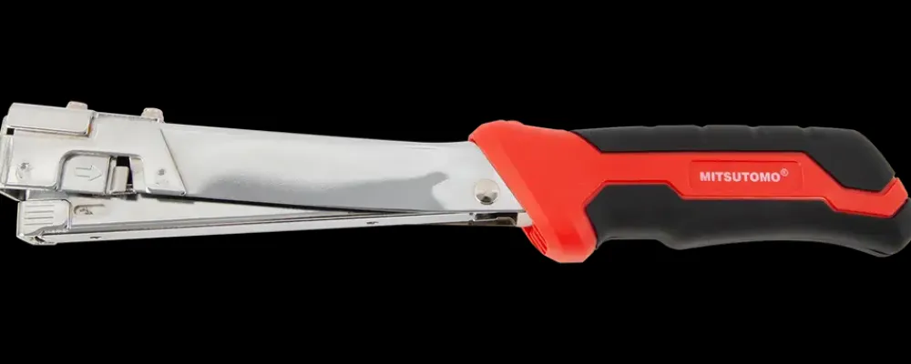 Enhåndsbetjent hæftehammer fra Mitsutomo med ergonomisk gummigreb.Til montering af isolering, beklædning, møbelpolstring og andet monteringsarbejde.Nem genopfyldning af hæfteklammer.