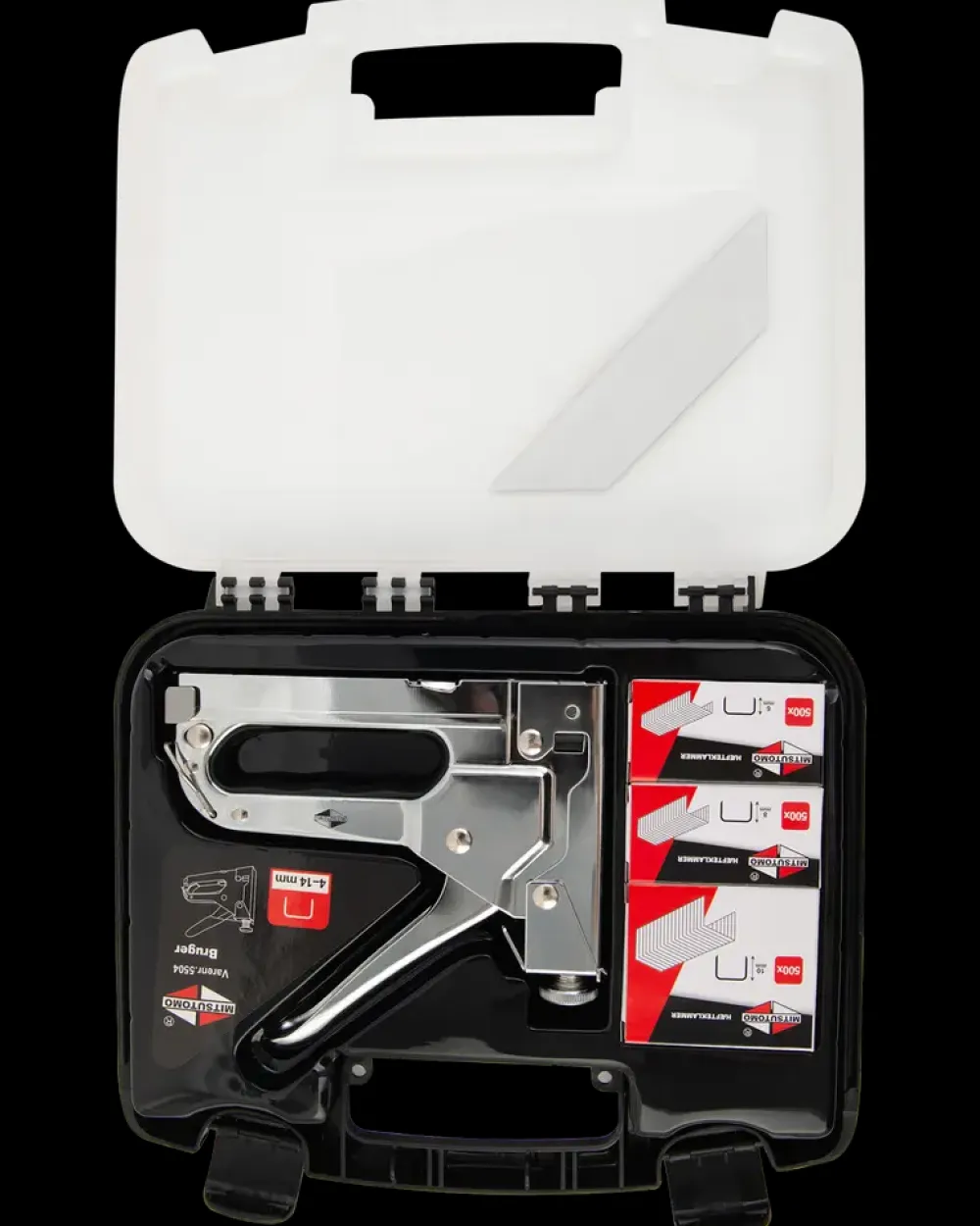 Hæftepistol med indstillelig slagstyrke fra Mitsutomo.Benlængde: 4-14 mm.Leveres i praktisk kuffert med følgende hæfteklammer:6 mm 500 stk.8 mm 500 stk.10 mm 500 stk.