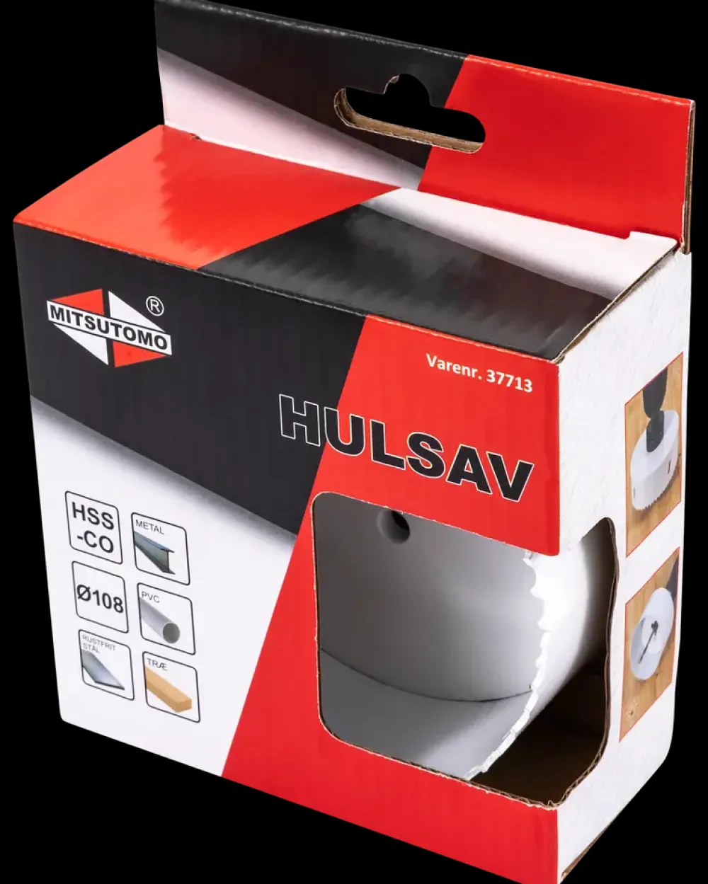 Hulsav fra Mitsutomo. Professionel håndværkerhulsav lavet af HSS Bi-metal M42 stål med 8% kobolt.Hulsaven sættes på en hulsavsholder og bruges med en batteri boremaskine, stationær bormaskine eller drejebænk.Den kan skærer i gipsplader, træ, lamineret træ, spånplader, kunststofplader, PVC, metaller, og er særdeles god til rustfrit stål.Skæredybde: 38 mm