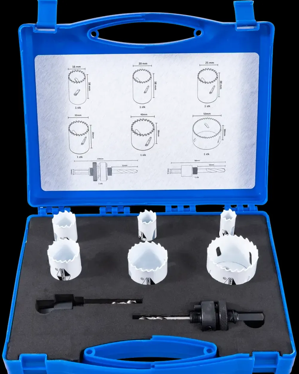 Hulsave fra Mitsutomo kan skære i gipsplader, træ, lamineret træ, spånplader, kunststofplader, PVC, metaller og rustfrit stål.Hulsavssættet leveres i praktisk transportkuffert.Produceret i M42 stålkvalitet med 8% Cobalt.Sættet består af:6 stk. hulsave: Ø16 – 20 – 25 – 32 – 40 – 50 mm.Skæredybde: 38 mm.1 stk. Hulsavsholder M44 til hulsave med diameter Ø16, 20, 25 mm.1 stk. Hulsavsholder M50 Quick til hulsave med diameter Ø32, 40, 50 mm.