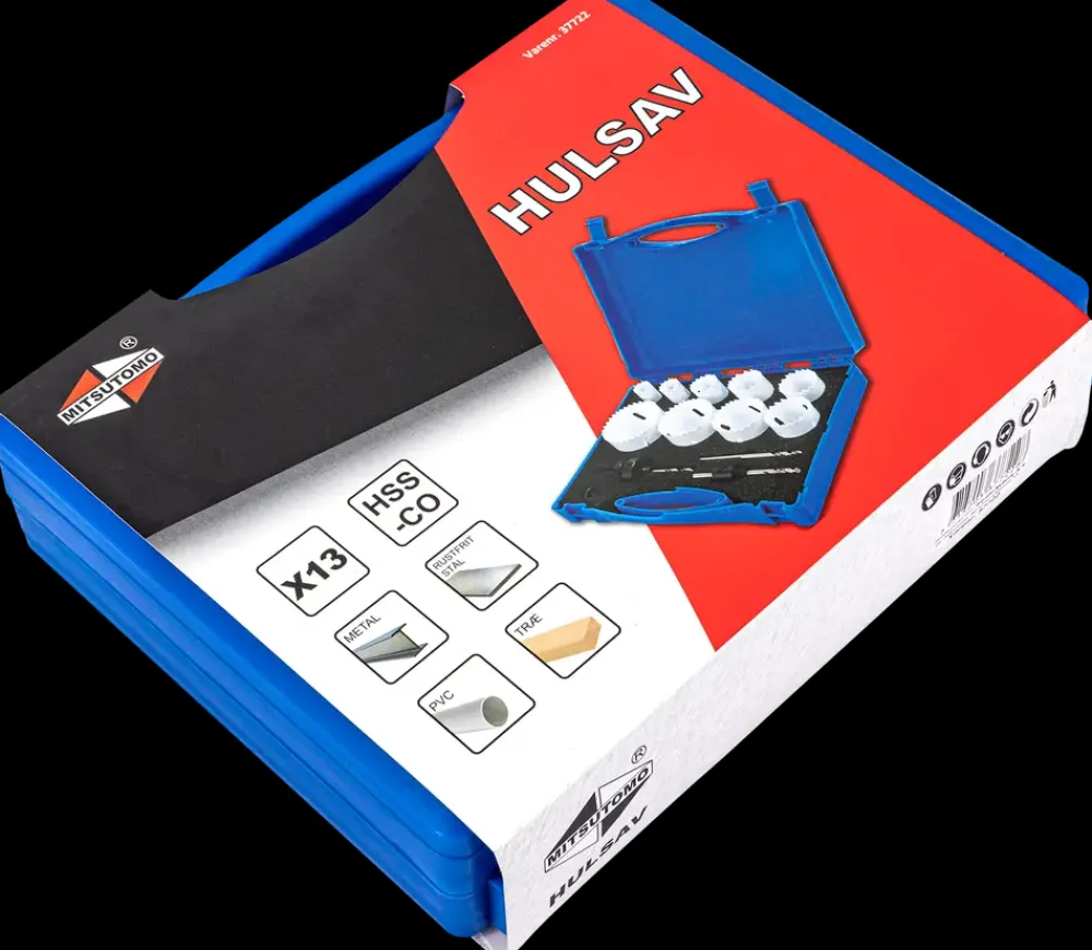 Hulsave fra Mitsutomo kan skære i gipsplader, træ, lamineret træ, spånplader, kunststofplader, PVC, metaller og rustfrit stål.Hulsavssættet leveres i praktisk transportkuffert.Produceret i M42 stålkvalitet med 8% Cobalt. Sættet består af:9 stk. hulsave: Ø19-22-29-35-38-44-51-57-64 mm.Skæredybde: 38 mm2 stk. hulsavsholdere.1 stk. Hulsavsholder M24K til hulsave med diameter Ø19, 22, 29 mm.1 stk. Hulsavsholder M50 Quick til hulsave med diameter Ø35, 38, 44, 51, 57, 64 mm.1 stk. ekstra MPD4 forbor magen til det forbor der allerede sidder i hver holder.1 stk. adapter der tillader at hulsave fra og med diameter Ø32 mm kan sættes på den lille holder M24K, som typisk anvendes hvis M50 holderens skaft på 11 mm er for stort til boremaskinens borepatron, idet nogle borepatroner maksimalt kan tage 10 mm skafter og M24K har et skaft på Ø6,35 mm.