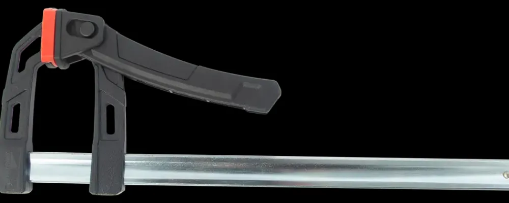 Hurtigtvinge fra Mitsutomo med enhåndsgreb.Den stærke hurtigtvinge bruges til at holde to limede flader sammen mens limen tørrer, eller sørger for, at materialet står stille under præcis savning.Det fleksible enhåndsgreb gør, at tvingens kæber presses sammen med én hånd, når håndtaget pumpes.