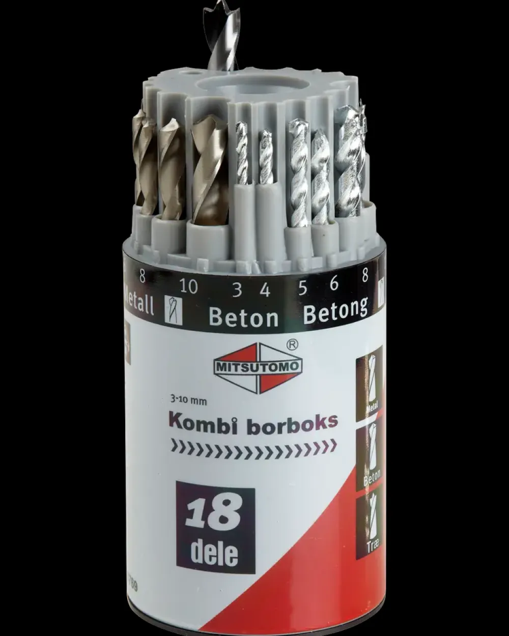 Borsortiment til træ, metal og beton fra Mitsutomo.Sættet består af:6 stk. metalbor: Ø 3, 4, 5, 6, 8, 10 mm.6 stk. mur/betonbor: Ø 3, 4, 5, 6, 8, 10 mm.6 stk. træbor: Ø 3, 4, 5, 6, 8, 10 mm.