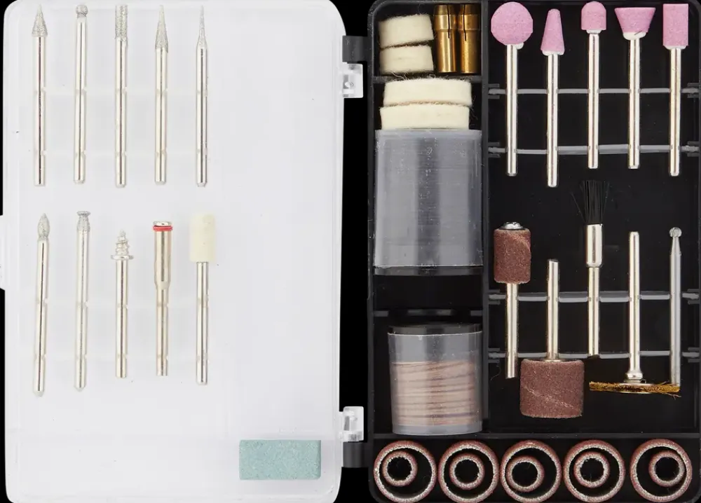 Multislibersæt fra Mitsutomo med 120 dele tilbehør. Skaft: Ø. 3,2 mm.Inkl. fleksibel aksel.Leveres med 120 stk. ass. tilbehør:3 stk. bøsninger: 1 x 1,6 mm, 1 x 2,3 mm, 1 x 3,2 mm.6 stk. slibebånd: 12,7 x 12,7 mm.6 stk. slibebånd: 6,3 x 12,7 mm.5 stk. slibesten med skaft: Ø. 3,2 mm.1 stk. holder til slibesten: Ø. 3,2 mm.1 stk. holder til filthjul: Ø. 3,2 mm.2 stk. skaft til slibebånd: Ø. 3,2 mm.1 stk. vådsten.1 stk. skruenøgle.36 stk. skæreskiver: 24 x 0,6 mm.40 stk. slibepapir.2 stk. filthjul: 25,3 x 6,3 mm.2 stk. filthjul: 12,7 x 6,3 mm.1 stk. HSS fræsere: Ø. 3,2 mm.7 stk. diamantslibestifter: Ø. 3,2 mm.3 stk. bor: 1 x 1,6 mm, 1 x 2,3 mm, 1 x 3,2 mm.2 stk. børster: Ø. 3,2 mm.1 stk. poleringshjul i uld: Ø. 3,2 mm.