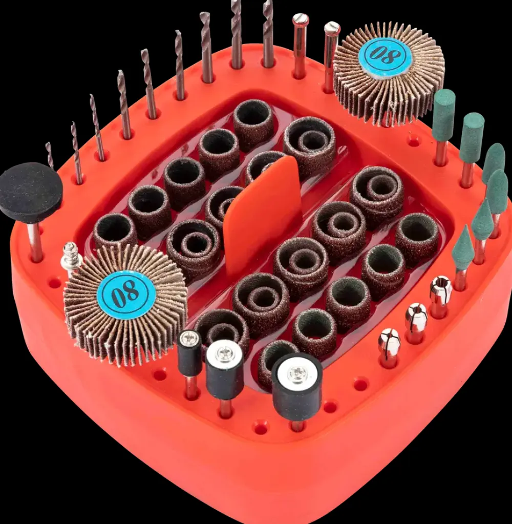 Multiværktøjs tilbehørssæt med 276 dele fra Mitsutomo er velegnet til hobbybrug.Sættet indeholder tibehør til slibning, polering, skæring og meget mere, bl.a. polertilbehør til smykker og glas, diamantskærere til gravering og slibebånd til grov og fin slibning af træ.Sættet kan bruges til træ, plast og metal.Kommer leveret i en smart og praktisk plastikkasse som har rum specielt til tilbehøret.Skaft på tilbehøret er Ø3,1 mm og kan bruges til andre mærker.Tilbehørssættet indeholder følgende:3 x Slibetromle:1 x Ø12 mm.1 x Ø9 mm.1 x Ø6 mm.52 x Slibebånd:18 x Ø12.7 x 12.7 mm= 9 x korn: 80, 9 x korn: 120.18 x Ø6.3 x 12.7 mm = 9 x korn: 80, 9 x korn: 120.16 x Ø9.5 x 12.7 mm = 8 x korn: 80, 8 x korn: 120.1 x Dorn til filtskiver9 x Filtskiver:2 x Ø25 mm.6 x Ø12 mm.1 x Ø9.5 mm.12 x Diamantskærere:1 x Diamantskærer bit, cylinder (Ø3 x 10 mm).1 x Diamantskærer bit, cylinder (Ø2.5 x 10 mm).1 x Diamabtskærer bit, cylinder (Ø2 x 10 mm).1 x Diamantskærerknop bit (Ø3 x 10 mm).2 x Diamantskærerkugle bit (1 x Ø4 mm, 1 x Ø2 mm).1 x Diamantskærerflamme bit.1 x Diamantskærerkegle bit.1 x Diamantskærer indvendig kegle bit.1 x Diamantskærer ladt hoved bit.1 x Diamantskærerspids bit.1 x Diamantskærer trådsliber bit.2 x Diamantskærerskiver:2 x Ø22 mm, 8 holes.9 x præcisionsbor (HSS = High Speed Steel = højhastighedsstål):3 x Ø3.2 mm.3 x Ø2.4 mm.3 x Ø1.6 mm.3 x spændetang (til roterende tilbehør):1 x Ø3.2 mm.1 x Ø2.4 mm.1 x Ø1.6 mm.6 x aluminiumoxidslibesten (rustfarvet):2 x Slibestenscylinder af aluminiumoxid (Ø16 x 10 mm).2 x Slibestenscylinder af aluminiumoxid (Ø10 x 13 mm).2 x Slibestenscylinder af aluminiumoxid (Ø10 x 19 mm).4 x siliciumcarbid slibesten (blå-grå):2 x Slibestenscylinder af siliciumcarbid (Ø20 x 4.8 mm).2 x Slibestenscylinder af siliciumcarbid (Ø10 x 3.2 mm).3 x PP børster:1 x Ø19 mm.1 x Ø15 mm.1 x Ø4 mm.3 x Stål børster:1 x Ø19 mm.1 x Ø15 mm.1 x Ø4 mm.1 x Messing børsteØ19 mm.20 x Slibeskiver:6 x Slibeskive af aluminiumoxid (Ø19 mm, korn:220) (Pink).6 x Slibeskive af siliciumcarbid (Ø19 mm, korn:180) (Blå-grå).6 x Slibeskive (Ø19 mm, korn: 120) (Hvid).2 x Gummi polerskive (Ø22 mm) (Grå).6 x gummipudsningsspids:2 x Cylinder.2 x Projektil.2 x tip.80 x Sandpapir:40 x Sandpapir i opbevaringsboks (Ø19 mm, grain: 220), (Rød).40 x Sandpapir i opbevaringsboks (Ø19 mm, grain: 240), (Sort).1 x Sandpapir bagskive.2 x dorn (skæreskive / slibeskive):1 x Ø1.9 mm.1 x Ø2.2 mm.36 x Skæreskive Ø23 mm.16 x glasfiberforstærket skæreskive Ø32 mm.1 x polerpasta.1 x slibesten.1 x Open-end skruenøgle.4 x slibevifter:2 x Slibevifter (Ø31.5 x 10 mm, korn: 80).2 x Slibevifter (Ø15 x 15 mm, korn: 80).