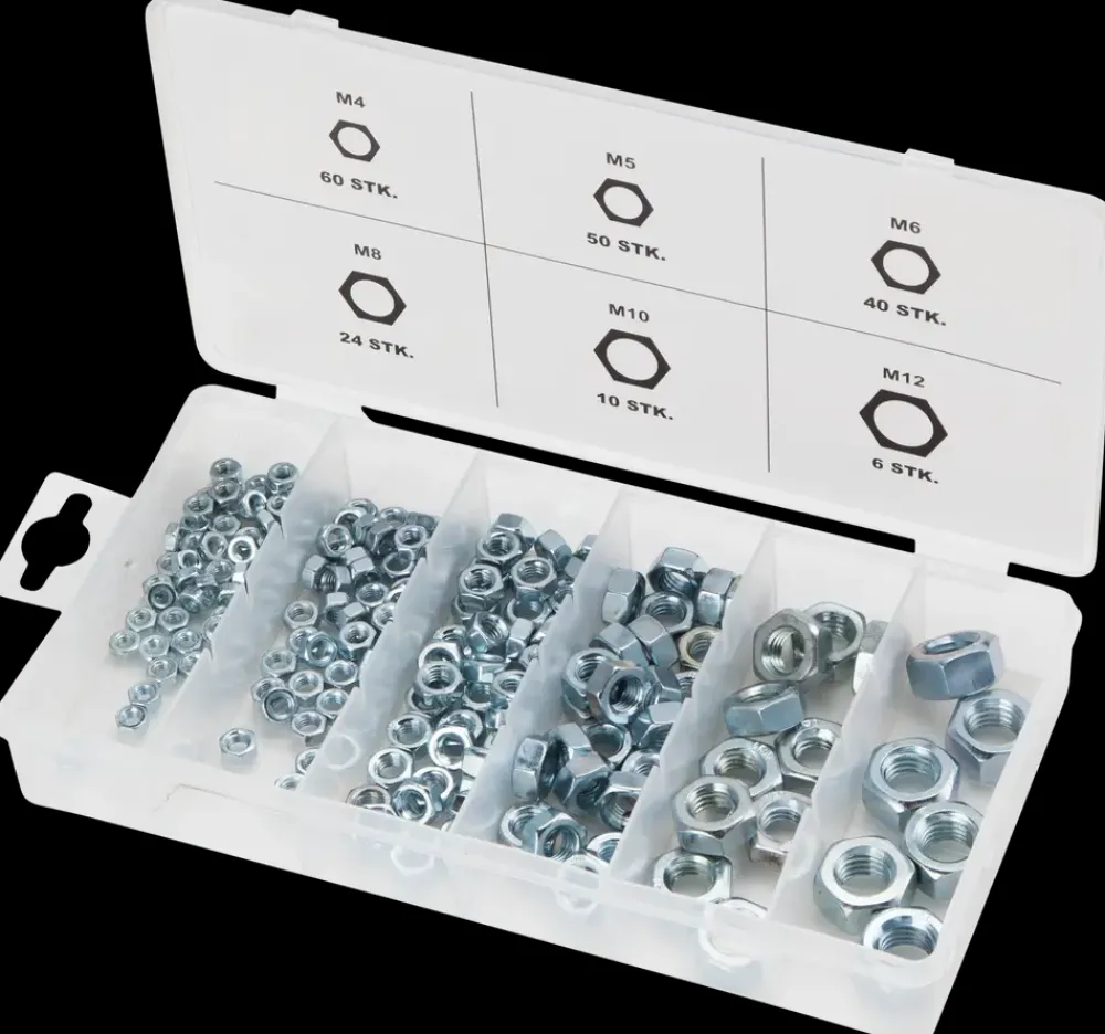 El-forzinkede møtrikker fra Mitsutomo, leveret i praktisk sortimentsboks. Sættet består af:60 stk: M4. 50 stk: M5. 40 stk: M6.24 stk: M8. 10 stk: M10. 6 stk: M12.