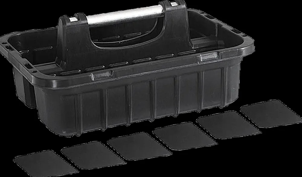Multikasse fra Mitsutomo i sort plast med håndtag i aluminium og mulighed for selv at inddele rum.