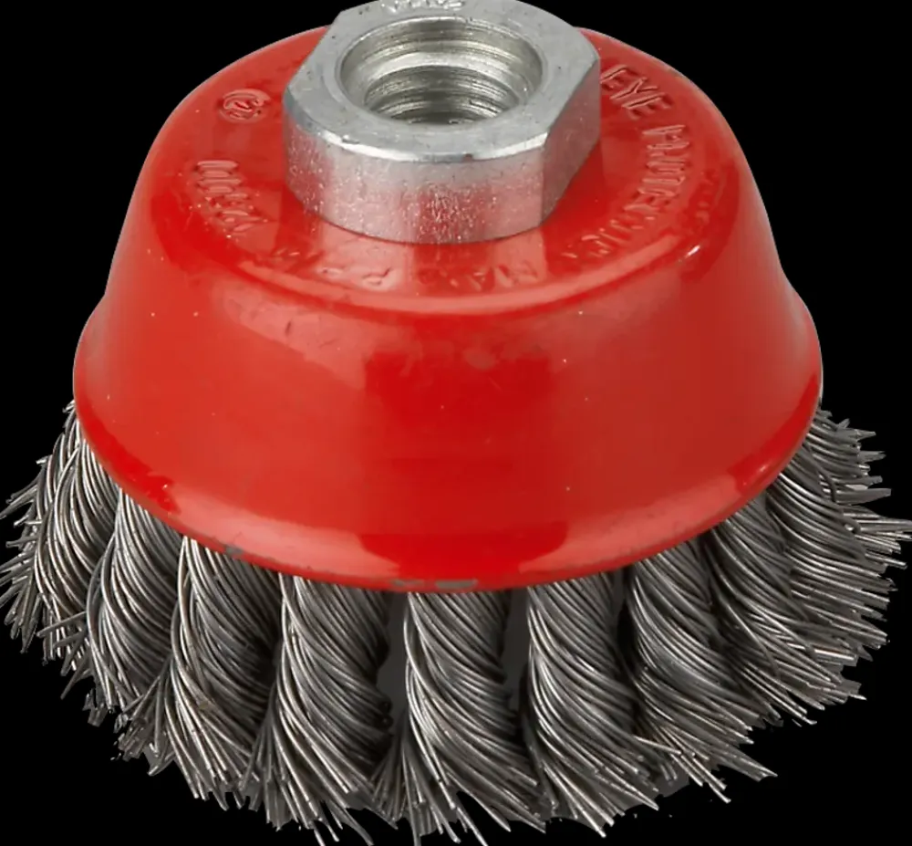 Kraftig stålbørste fra Mitsutomo til montering på vinkelsliber.Ideel for fjernelse af rust og afpudsning af gammel kalk m.m.