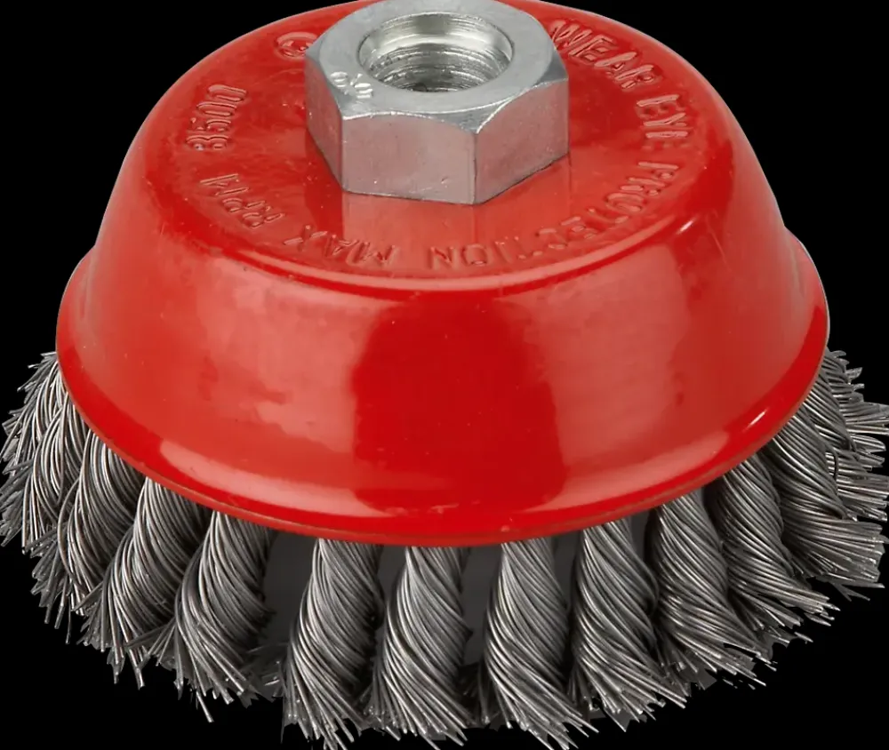 Stålbørste fra Mitsutomo til montering på vinkelsliber. De kraftige stålbørster fjerner effektivt maling, rust og lign. på metal og andre hårde genstande.