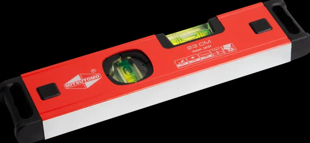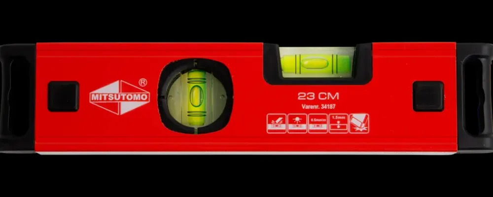 Mitsutomo vaterpas er fremstillet i let aluminium og har en godstykkelse på 1,5 mm.Vaterpasset har 3 libeller 90°, 180° og 45° så man kan måle om emner er i vater (vandret) eller lod (lodret), eller har en hældninger på 45°.Derudover er vaterpasset udstyret med stødabsorberende gummi på enderne.Vaterpasset har en planfræset anlægsflade og nøjagtighed på ±0.5 mm/m.Vaterpas med stødabsorberende gummi og 3 libeller.Godstykkelse: 1,5 mm.Nøjagtighed: ±0.5mm/m.