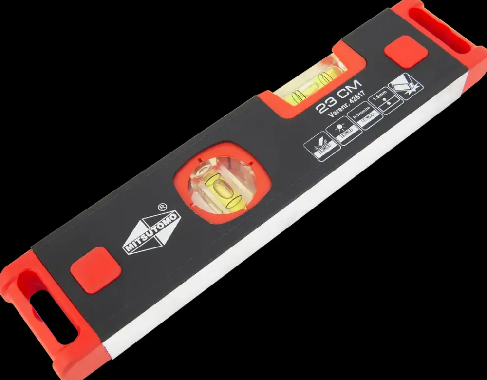 Dette vaterpas fra Mitsutomo er designet til præcisionsarbejde. Med en længde på 23 cm er det ideelt til opgaver, hvor der kræves kompakt og nøjagtig nivellering.Vaterpasset er udstyret med tre libeller, der muliggør måling i både vandret (180°), lodret (90°) samt i 45° vinkel. Det giver alsidighed ved montage, snedkerarbejde og installationsopgaver. Den planfræsede anlægsflade sikrer høj præcision med en nøjagtighed på ±0,5 mm/m.Produktet er fremstillet i let, men robust aluminium og har en godstykkelse på 1,5 mm. Enderne er udstyret med stødabsorberende gummi, hvilket beskytter vaterpasset mod slag og bidrager til længere holdbarhed.Det sorte og røde design kombineret med de klare libeller gør det nemt at aflæse målinger hurtigt og præcist.