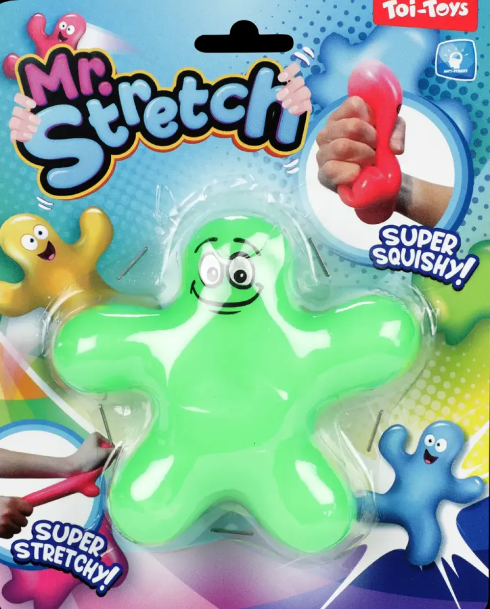 Mr. Stretch er et stress klemmelegetøj, på 10 cm, med sjove ansigter.Der er 4 forskellige farver: Pink, blå, gul og grøn.Det er ikke muligt at vælge farve i webshoppen.