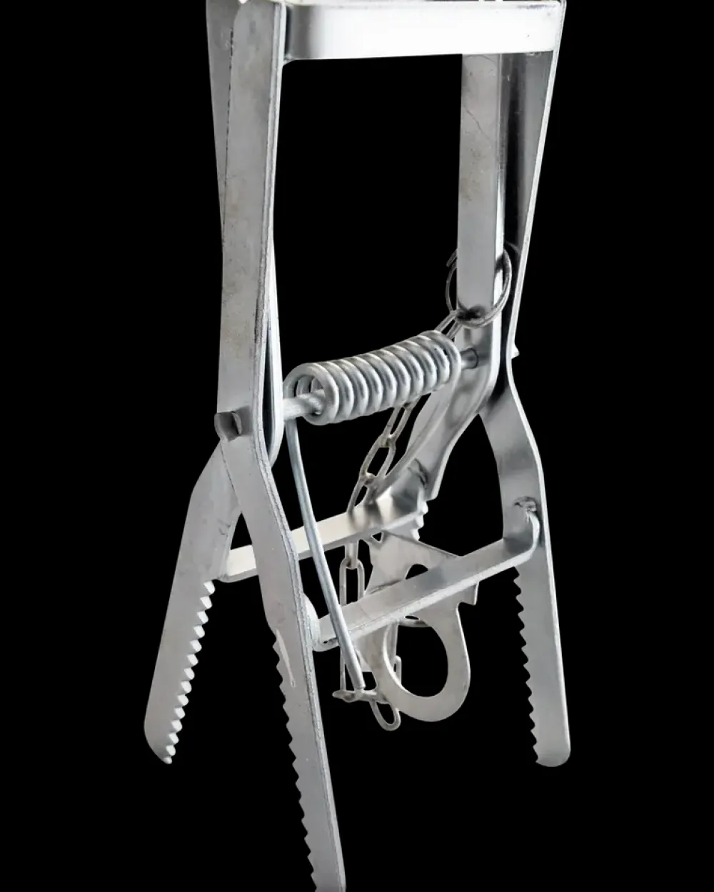 Muldvarpesaks med fjeder og klo til bekæmpelse af muldvarper. Fælden spændes og placeres i et hul i muldvarpeskuddet.