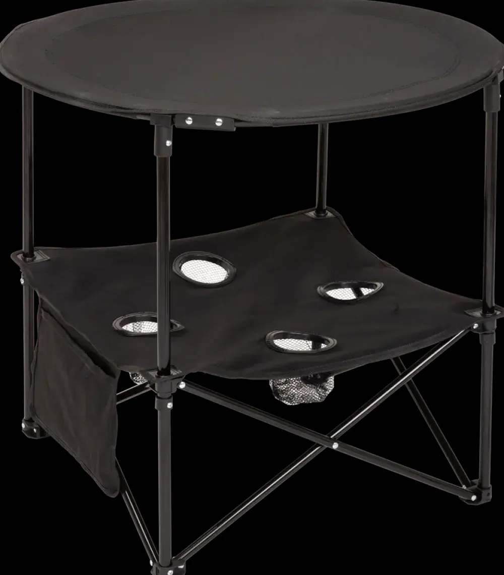 Festivalbord med to niveauer til camping, picnic og andre udendørs aktiviteter. Øverste niveau fungerer som bordplade, mens den nederste hylde giver ekstra opbevaringsplads.Hylden er udstyret med 4 net-kopholdere samt en netlomme i midten til mindre genstande. Stellet er fremstillet af stål, og bordplade samt hylde er udført i kraftigt og slidstærkt polyesterstof med mesh og plastdetaljer. Materialevalget giver en let konstruktion, der samtidig er stabil under brug.Bordet kan foldes sammen og opbevares i medfølgende bæretaske, hvilket gør det nemt at transportere og opbevare mellem brug.